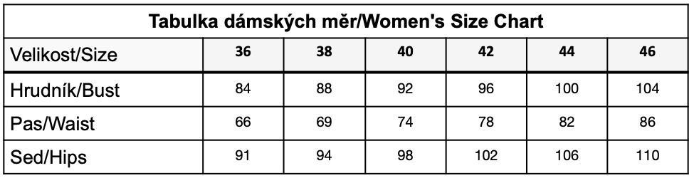 | Size | 36, 38, 40, 42, 44, délka ke klenům |