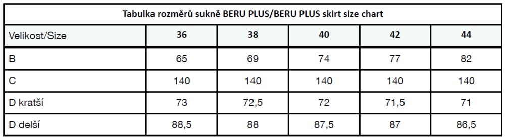 Modelka na fotce je vysoká 183 cm a má velikost 36, focená je v sukni BERU PLUS velikosti 38.